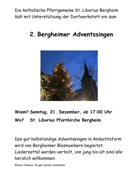Am kommenden Sonntag ist wieder soweit: nach der erfolgreichen Premiere im letzten Jahr findet nunmehr das 2. Bergheimer Adventssingen statt.