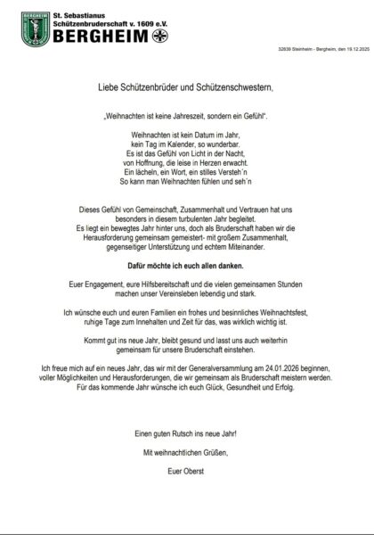 Weihnachtsgruß der Schützenbruderschaft Bergheim